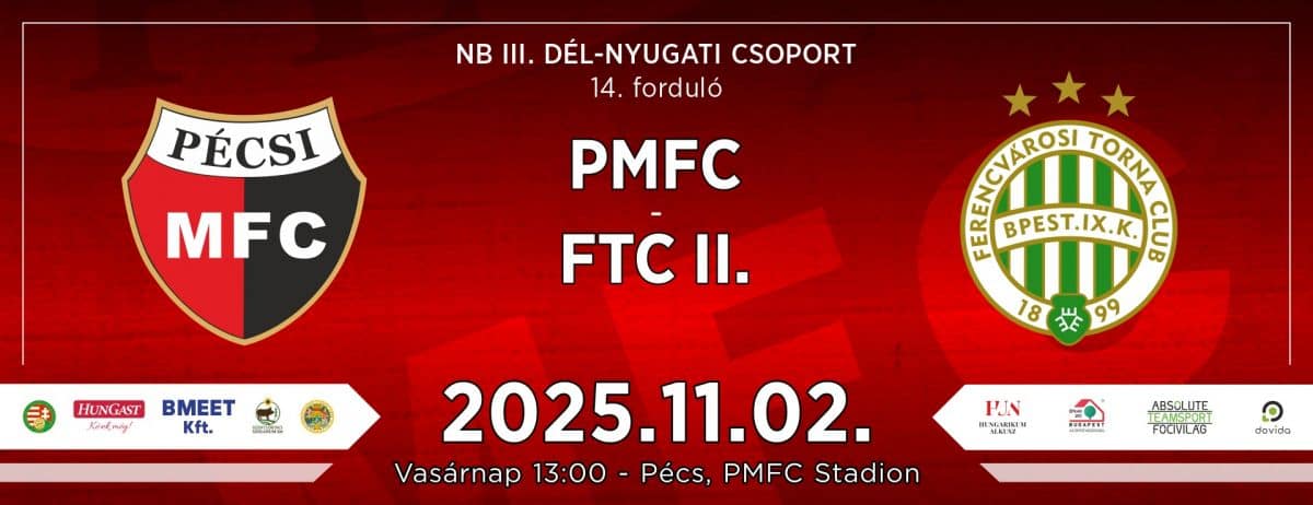 Másnap, vasárnap NB III-as együttesünk is itthon lép pályára: a Dél-Nyugati csoport 14. fordulóban a jelenleg második helyen álló FTC II. látogat Pécsre. Bár a tabellán négy pozíció választja el a két csapatot, a fővárosi zöld-fehér tartalékok előnye mindössze három pont, így szoros, izgalmas mérkőzésre van kilátás a Stadion utcában.