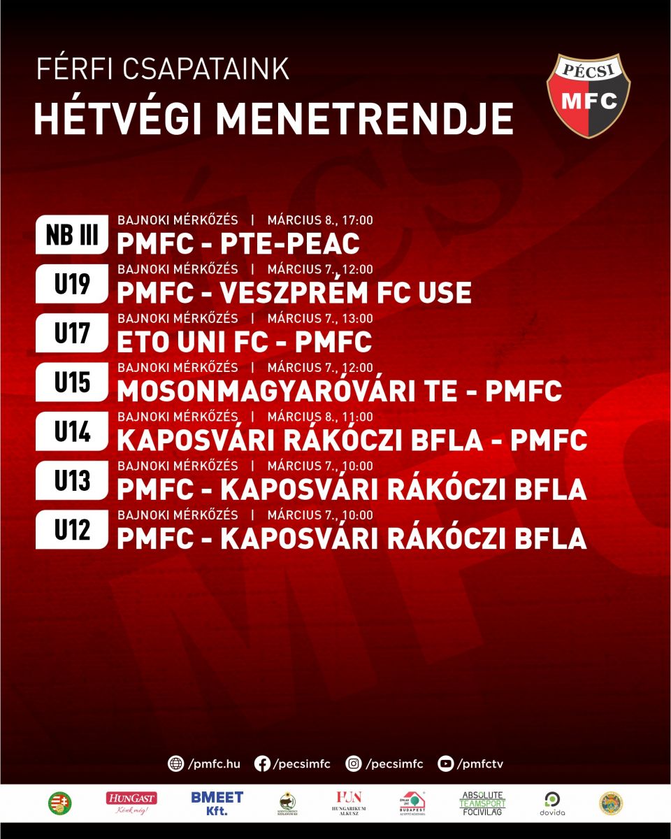 A PMFC fiú utánpótlás-csapatai izgalmas bajnoki hétvégére készülnek . Szombaton délelőtt 10 órakor az U12 és az U13 korosztály nyitja a sort a Kaposvár ellen az Idősebb Dárdai Pál Utánpótlás Edzőközpontban. Délben az U15-ösök Mosonmagyaróváron lépnek pályára, míg az U19-esek a Veszprémet fogadják ugyanebben az időpontban. Délután 13 órától az U17-esek Győrben mérkőznek. Vasárnap, vagyis március 8-án 11 órakor az U14-es csapat a Kaposvár vendégeként zárja a hétvégi programot. A női korosztályok ezúttal szünetelnek a válogatottak szereplése miatt. A hétvége remek alkalom a fiatal játékosoknak a fejlődésre és a pontszerzésre, szurkoljunk együtt a PMFC utánpótlásának!