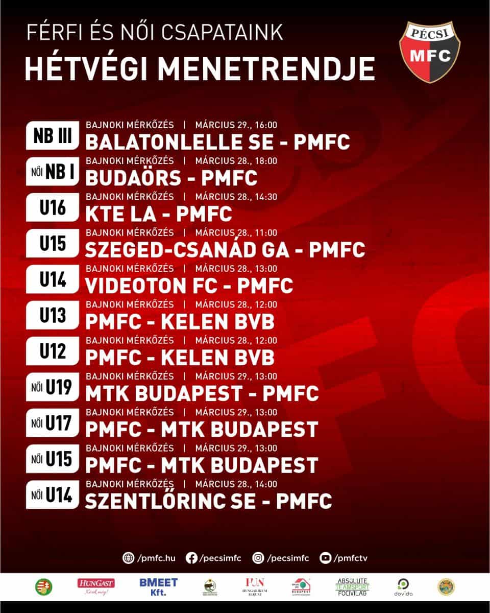 Szombaton és vasárnap egyaránt bajnoki feladatok várnak nagypályás utánpótláscsapatainkra. A sort az U15-ösök nyitják, akik szombaton 11:00-tól a Szeged-Csanád GA otthonában lépnek pályára. Szinte egy időben, 12:00-kor hazai környezetben az U12-es és az U13-as gárdánk is összecsap a Kelen BVB ellen. A délutáni órákban az U14-esek a Videoton FC vendégeként szerepelnek (13:00), majd 14:00-tól a leány U14-esek a Szentlőrinc SE ellen mérkőznek meg idegenben. A szombati programot az U16-osok zárják, akik 14:30-tól a KTE LA pályáján bizonyíthatnak. Vasárnap a női akadémia együttesei kerülnek főszerepbe. A leány U19-es csapat az MTK Budapest vendége lesz (13:00), miközben ugyanekkor hazai pályán fogadják a fővárosiakat az U17-es és az U15-ös korosztályunk is.