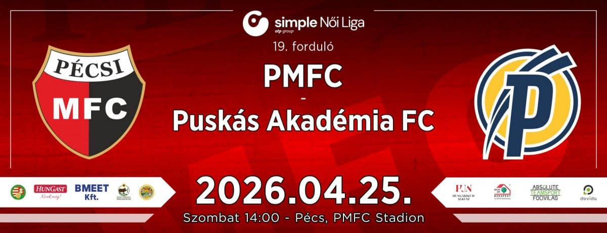 Háromhetes válogatott szünet után újra bajnoki ritmusba kapcsol női NB I-es labdarúgócsapatunk: a Simple Liga 19. fordulójában április 25-én, szombaton 14:00-kor a Puskás Akadémia FC-t fogadjuk a PMFC Stadionban. A szezon utolsó előtti hazai mérkőzése komoly kihívást tartogat, hiszen a tabella második helyén álló, 22 ponttal előttünk járó felcsúti együttes érkezik Pécsre. Csapatunk azonban elszántan várja az összecsapást, és mindent megtesz annak érdekében, hogy megnehezítse a rivális dolgát.